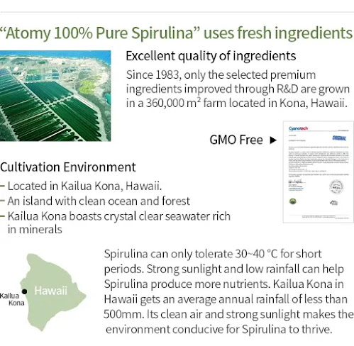 Atomy 100% Pure Spirulina is a natural health product with essential nutrients including protein, carbohydrates, lipid, dietary fiber, vitamins, minerals, and antioxidants.